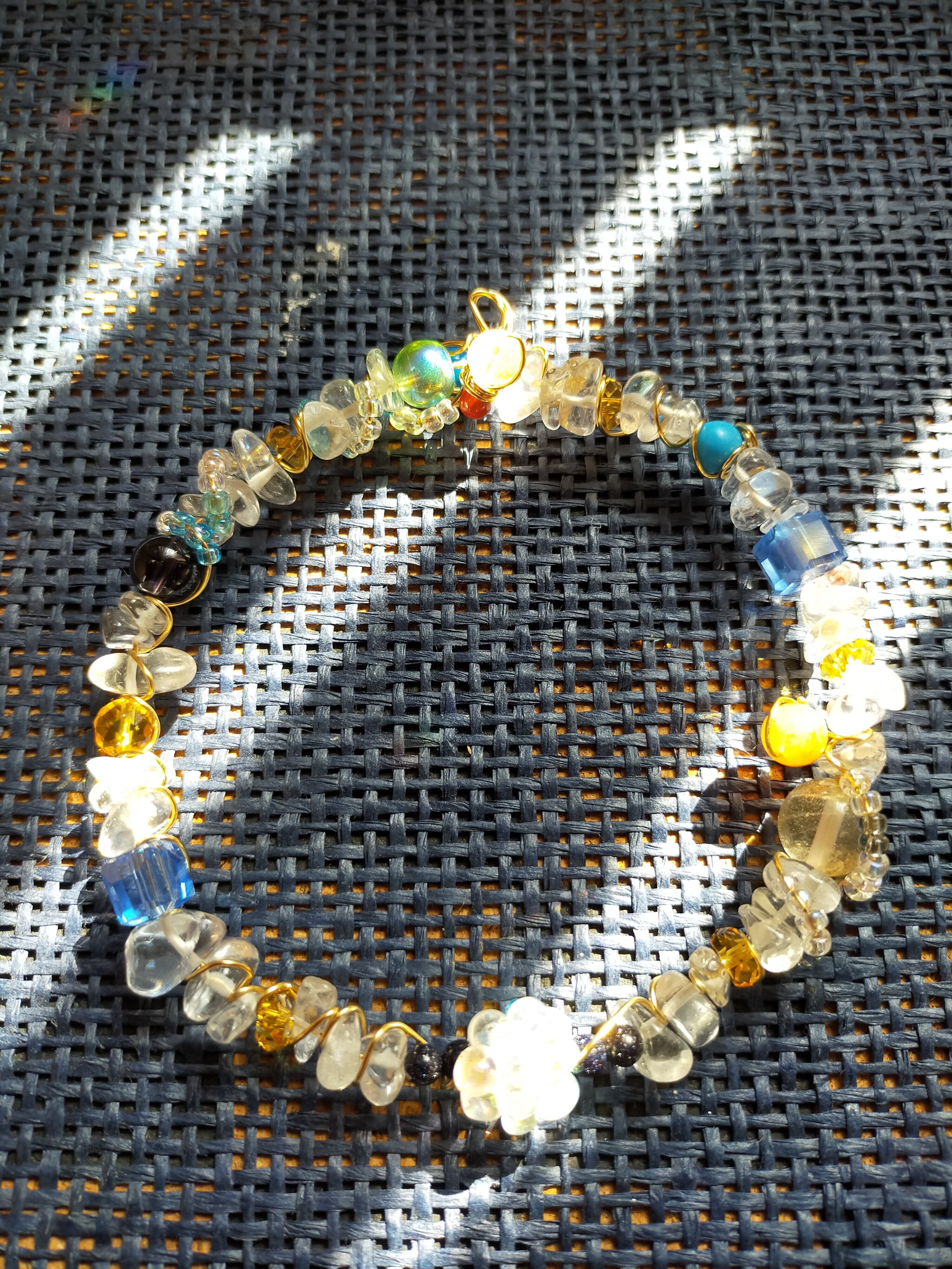 カラフルなビーズ&パワーストーンをインスピレーションワイヤーに通して、つなげて、輪っかにしています♪